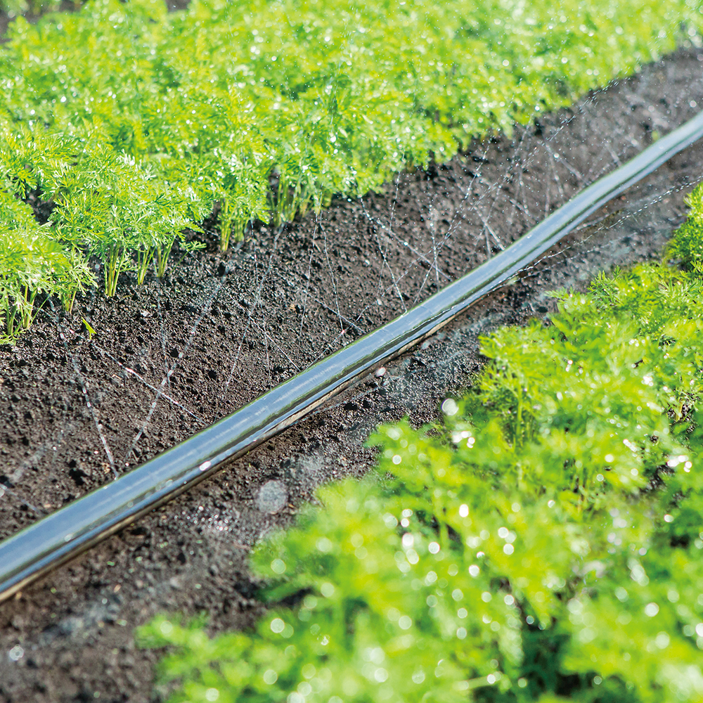 当社は長年、潅水チューブで”水”を効率的・効果的にコントロールするために穴のあけ方や水の飛び方、ねじれに強いチューブ構造など様々な研究を行っています。当社が提供する潅水チューブは、多くの生産者より使いやすいとの支持を頂いております。また、潅水作業の効率化だけではなく、独自開発の多孔管チューブによって、栽培環境の改善(暑熱対策)も可能としました。