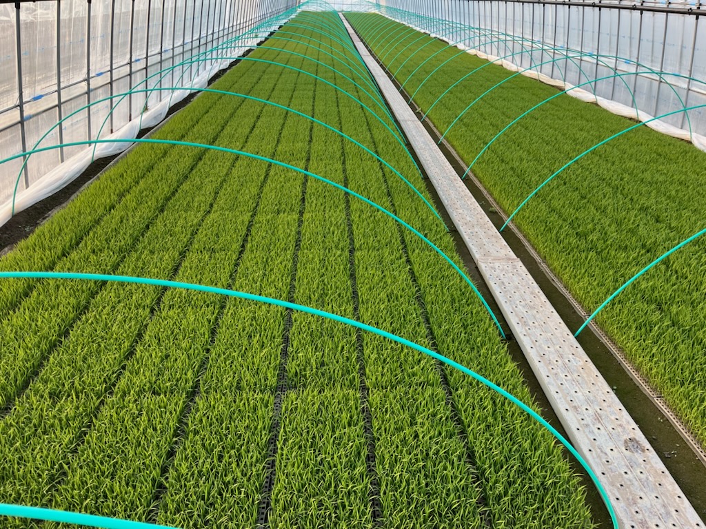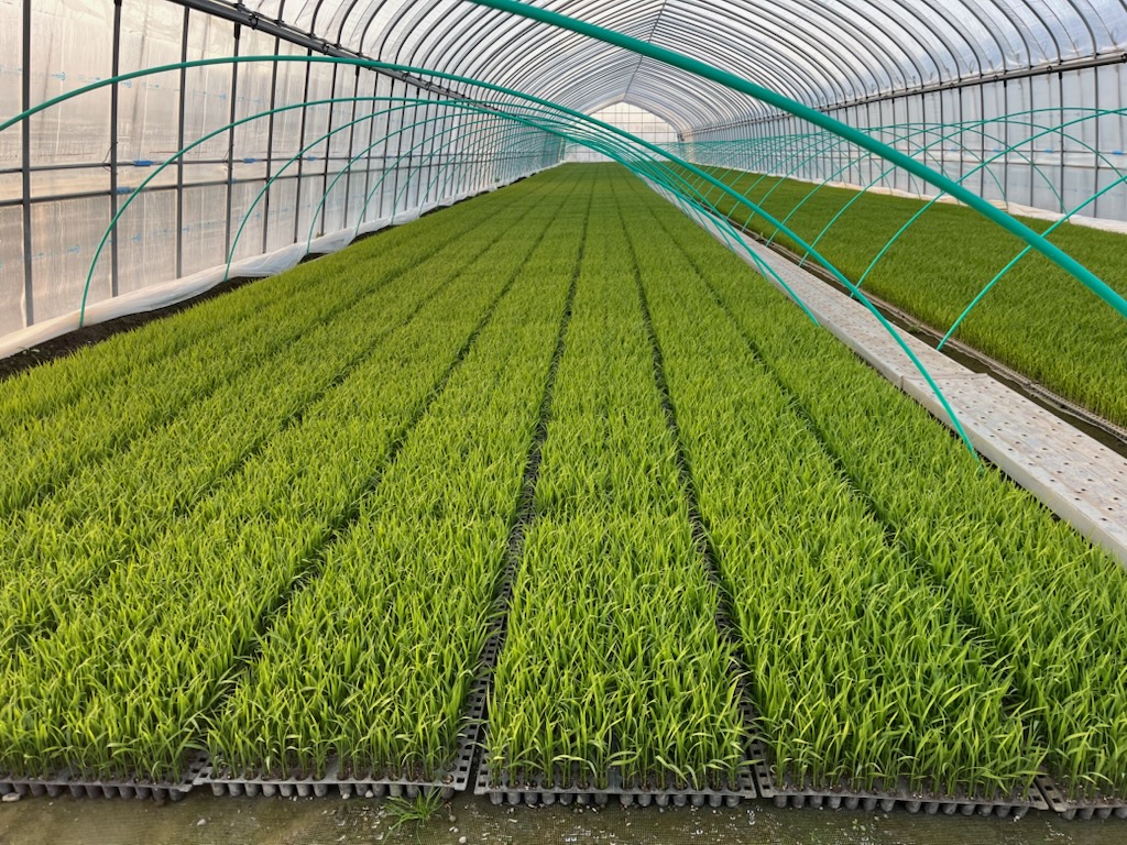 石谷ファームさんは風連町で21ヘクタールの水田でもち米を栽培しており、水稲苗は間口:6.3m×長さ:50mの育苗ハウス10棟で育苗されています。