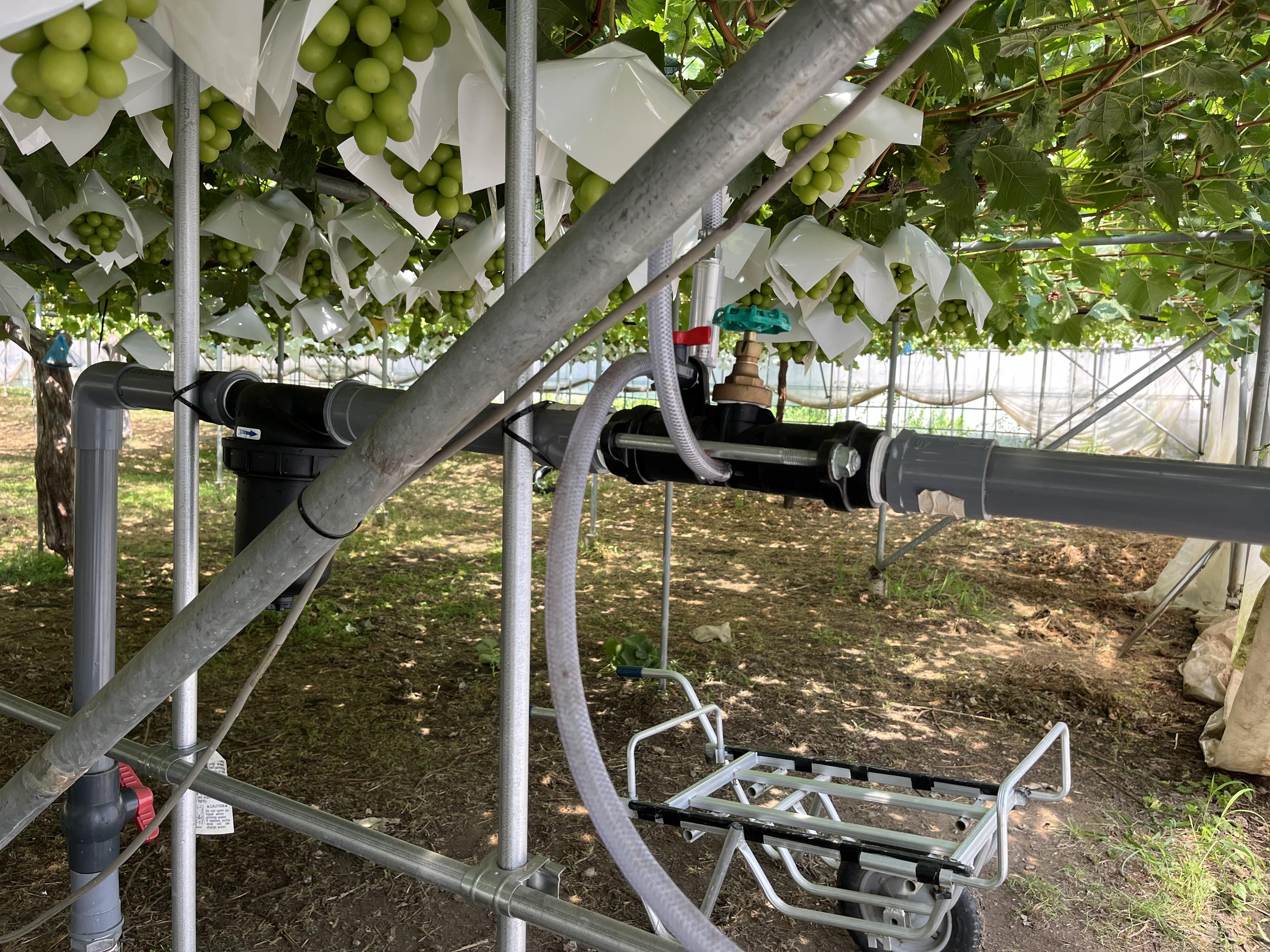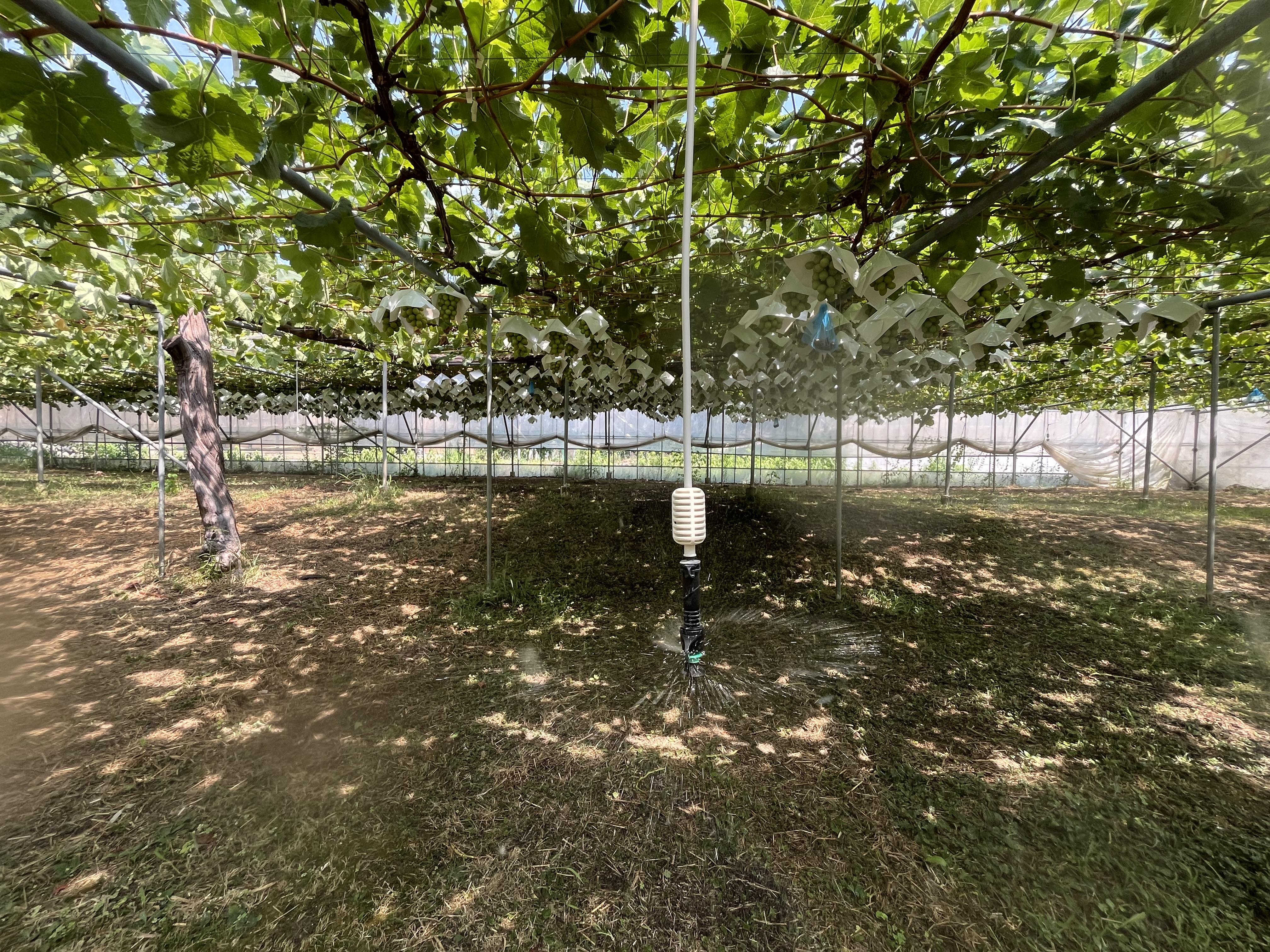 横山さんのブドウ圃場での潅水は、以前は地面に設置するスプリンクラーを使用していましたが、昨年吊り下げスプリンクラー「スーパーネットUD」を導入いただきました。