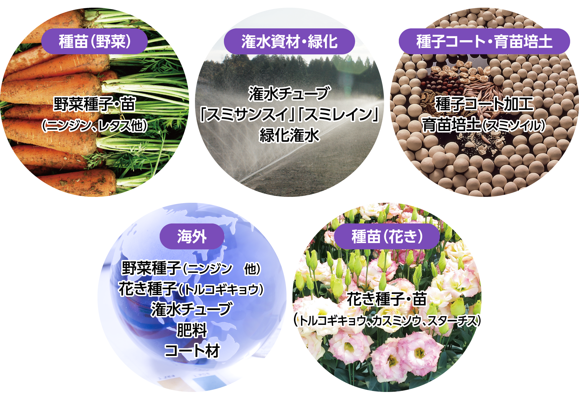 取り扱い商品は、野菜種子ではニンジン、レタス、ブロッコリー、タマネギ、ホウレンソウ、スイートコーン、ハクサイなど各種野菜の種苗を提供、花種子では、トルコギキョウとスターチスの様々な品種を提供しています。また、潅水資材も扱っています。