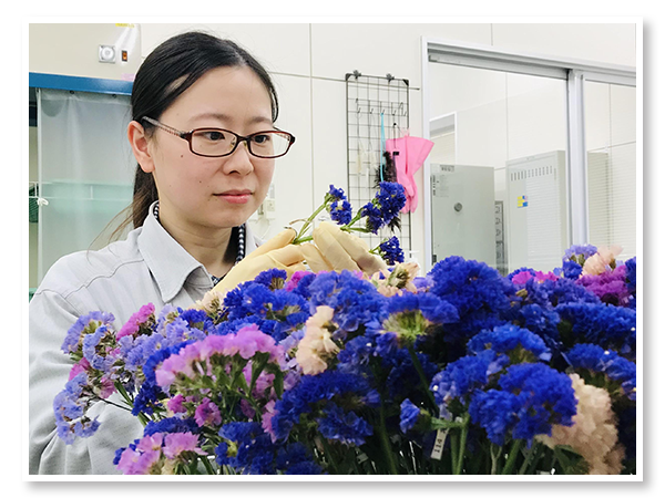 主に野菜・花の販売品種、開発品種の耐病性評価を行っています。メインで携わっているのはニンジン、トルコギキョウ、スターチスです。販売品種や素材となる品種等の耐病性を評価するために、野菜や花の苗を育て、適切な生育ステージとなった植物体へ病原菌を接種します。耐病性の強弱は、コントロール品種(既に耐病性の強弱がわかっている品種)と比較して判断します。